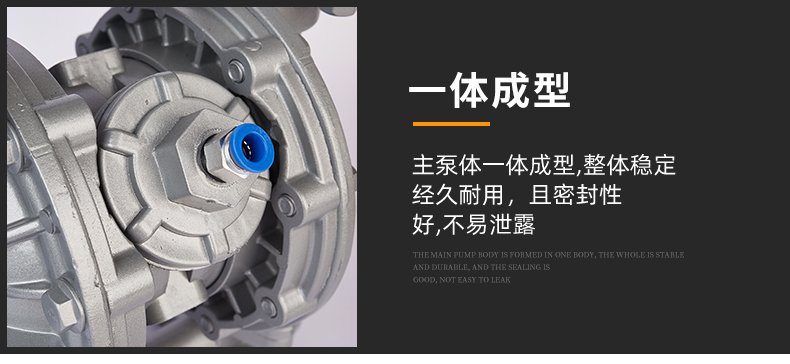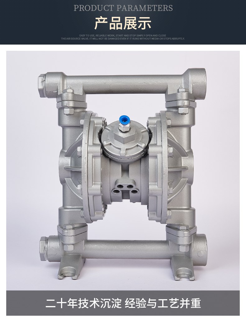 在泵的兩個對稱工作腔中,各裝有一塊有彈性的隔膜,聯桿將兩塊隔膜結成一體,壓縮空氣從泵的進氣接頭進入配氣閥后,推動兩個工作腔內的隔膜,驅使聯桿聯接的兩塊隔膜同步運動。與此同時,另一工作腔內的氣體則從其隔膜的背后排出泵外;一旦到達行程終點,配氣機構則自動地將壓縮空氣引入另一工作腔,推動隔膜朝相反方向運動,這樣就形成了兩個隔膜的同步往復運動。每個工作腔中又設置有兩個單向球閥,隔膜的往復運動,造成工作腔內容積的改變,迫使兩個單向球閥交替地開啟和關閉,從而將液體連續地吸入和排出。